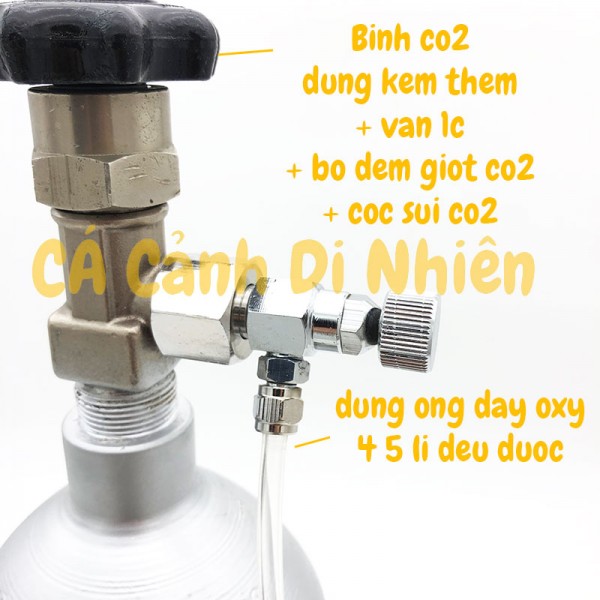 Những phụ kiện bạn cần mua thêm khi sử dụng bình co2: van 1 chiều, dây oxy 4 hoặc 5 li, bộ đếm giọt Co2, cốc sủi co2.
