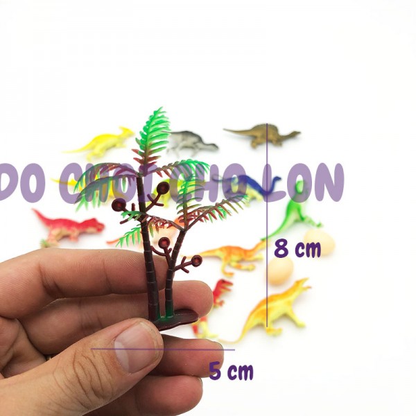 Kích thước bộ sản phẩm: 20 cm x 21 cm, khủng long: 10 x 4 cm, cây: 8 x 5 cm, trứng: 4 x 2 cm
