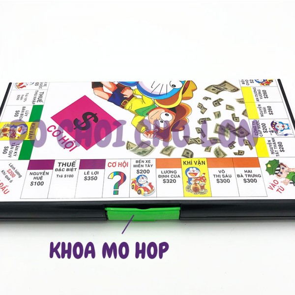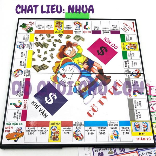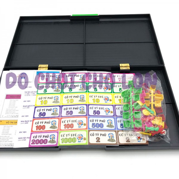 Bộ sản phẩm gồm: các thẻ, quân cờ, bàn cờ bằng nhựa, tiền, nhà, v.v....