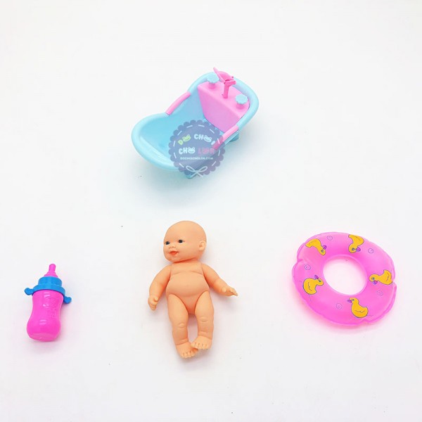 Bộ sản phẩm gồm: búp bê em bé, bồn tắm, phao, bình sữa, vòi sen