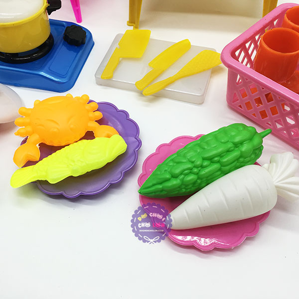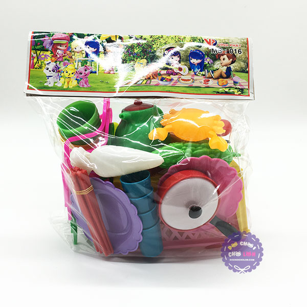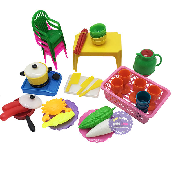 Bộ sản phẩm gồm các dụng cụ nấu ăn như: 1 bàn nấu ăn, 4 cái ghế, 2 cái nồi, 4 ly rượu, 4 ly nhỏ, 1 rổ, 1 dao, 1 bếp ga, 4 cái chén, 2 cái dĩa, 1 tấm thớt,.....