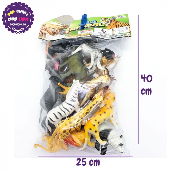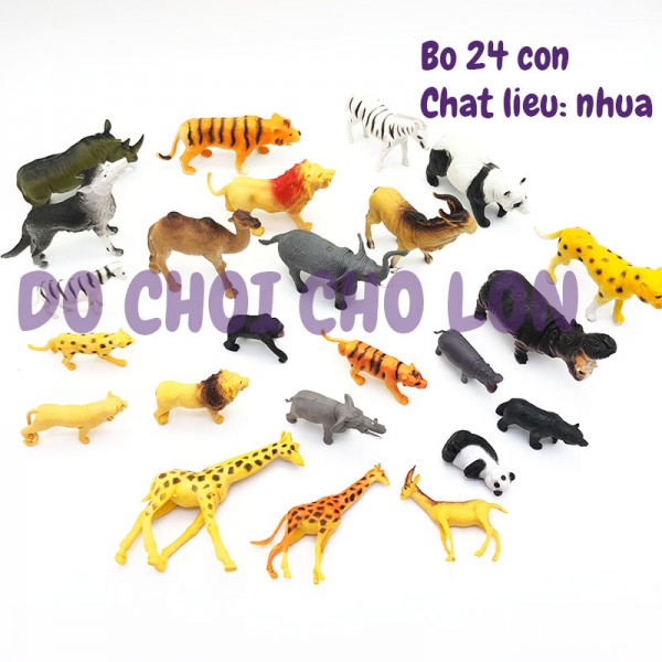 Bộ sản phẩm gồm 24 con thú sống trong rừng khác nhau như: cọp, sư tử, beo, gấu trúc, voi, ngựa vằn, hươu cao cổ, hà mã,v.v...