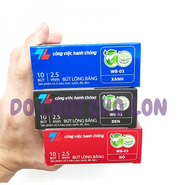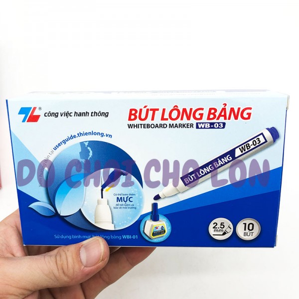 Bút lông bảng Thiên Long WB-03 bút Thiên Long xóa được WB03 đầu bút 2.5mm được sản xuất theo công nghệ hiện đại, đạt tiêu chuẩn an toàn quốc tế. Với ưu điểm viết tốt, trơn, êm trơn trên bảng trắng, thủy tinh và những bề mặt nhẵn bóng. Sử dụng mực mới, tốt, màu mực đậm, tươi sáng, có thể dễ dàng xóa sạch ngay cả khi viết trên bảng lâu và không để lại bóng mực sau khi lau bảng và các bề mặt nhẵn bóng.
