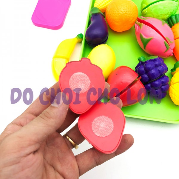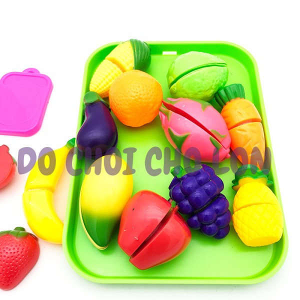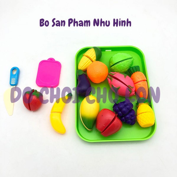 Bộ sản phẩm gồm: khay nhựa, 12 loại trái cây, dao, thớt