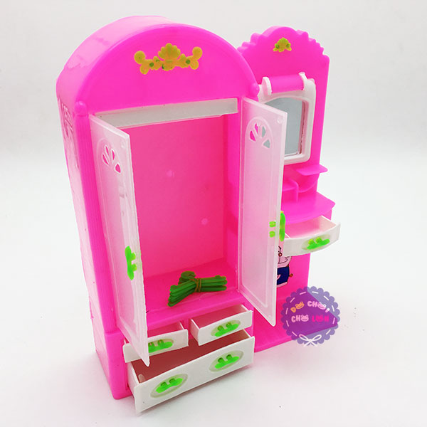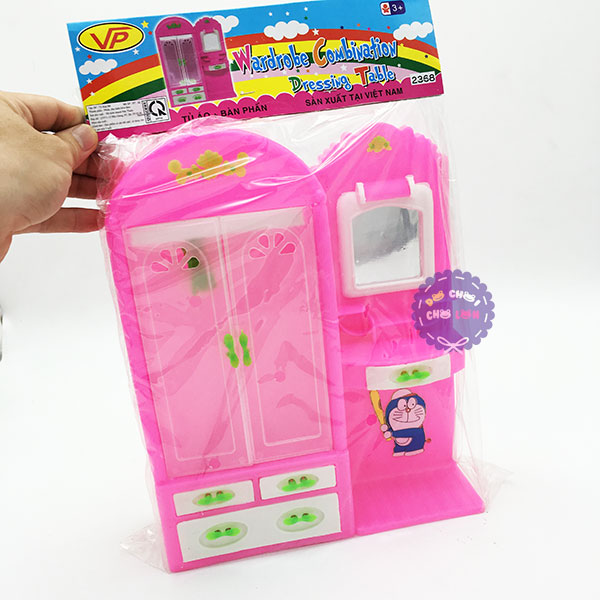 Bộ sản phẩm gồm: 1 tủ búp bê có bàn phấn, móc treo quần áo búp bê