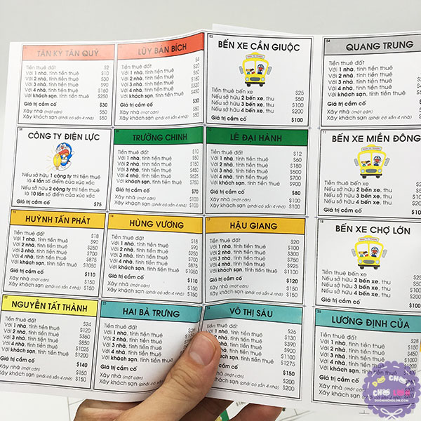 - Khi nhận được lệnh “sửa chữa cầu đường”, bạn phải trả phí cho tòan bộ các nhà và khách sạn mình đang sở hữu trên bàn cờ.