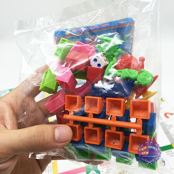 Bộ sản phẩm gồm: các thẻ, quân cờ, bàn cờ bằng giấy, tiền, nhà, v.v....