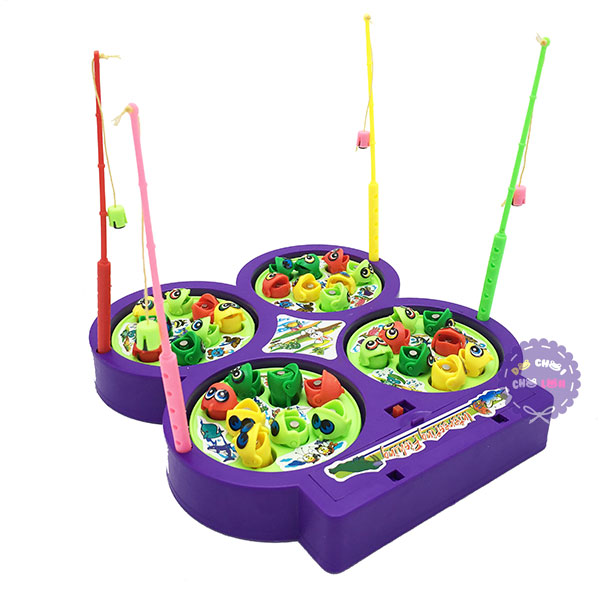 Đặc điểm: khi gắn pin vào các chú cá sẽ chồi lên chụp xuống, khay cá thì xoay tròn, với 4 cần câu bé có thể chơi cùng bạn bè cùng nhau thi xem ai câu nhiều hơn