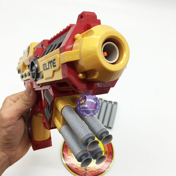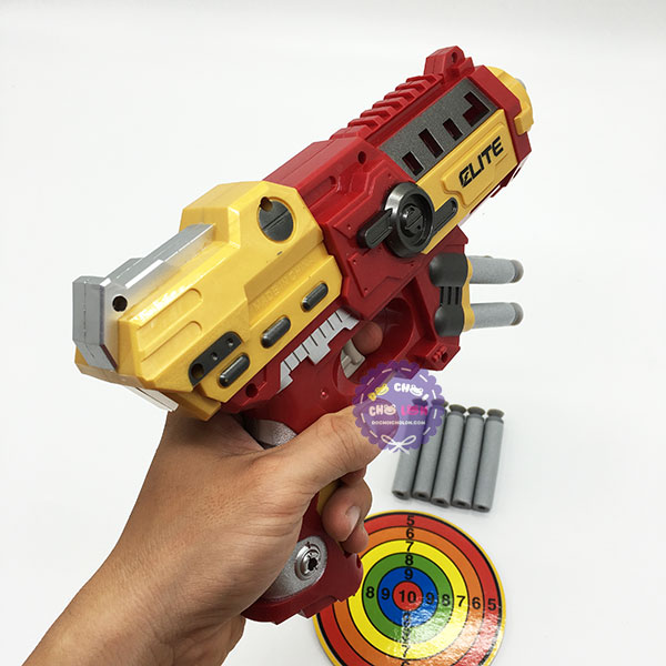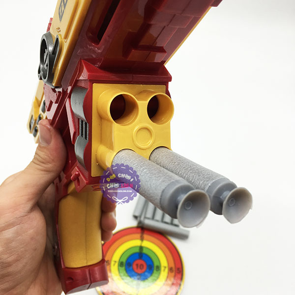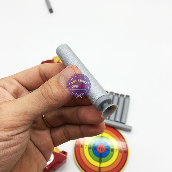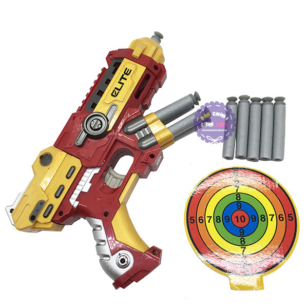 Bộ sản phẩm gồm: 1 súng người sắt, 1 bia tập bắn tính điểm, và đạn mút xốp mềm.