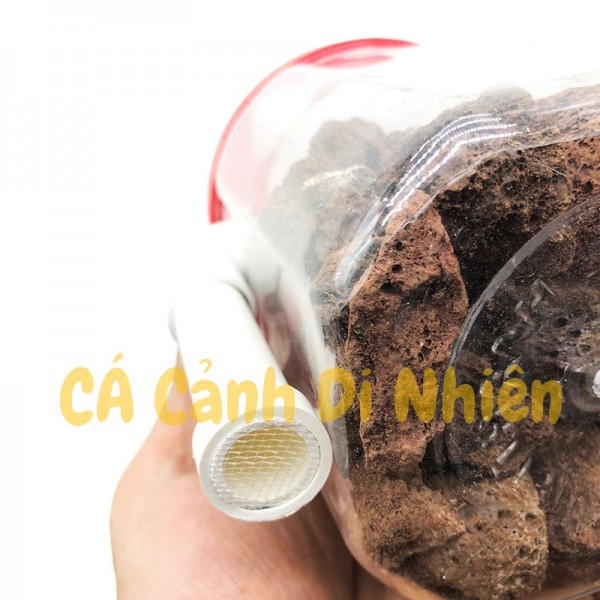 - Sản phẩm sử dụng chung với máy sủi oxy và dây oxy, gắn dây oxy vào van chữ L bằng mica trên hình, sau đó bỏ hộp lọc vào hồ cá