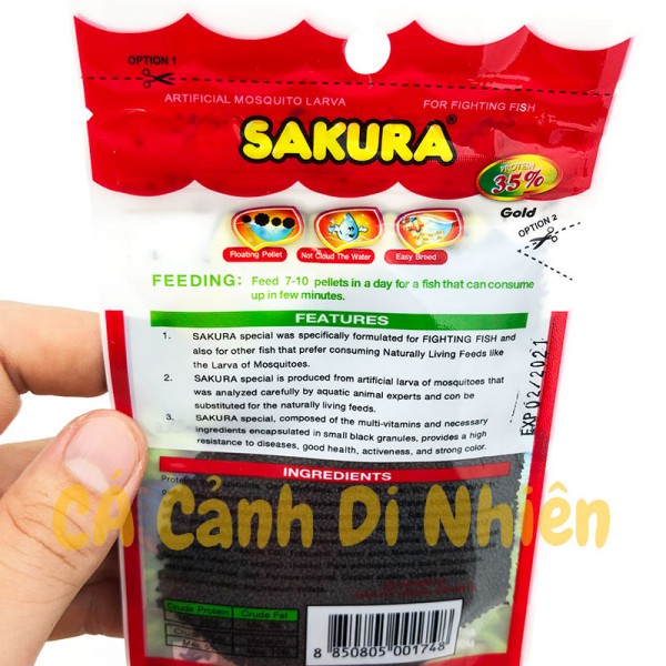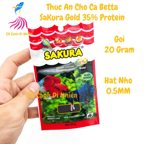 Thức ăn cho cá BETTA SAKURA GOLD 35% Protein 20 gram là thực phẩm, cám cá chuyên dành cho cá betta và các loại cá cảnh nhỏ với độ đạm lên tới 35% giúp cá mau lớn, lên màu, hỗ trợ tiêu hóa và giúp cá khỏe mạnh mà không gây đục nước làm dơ hồ cá.