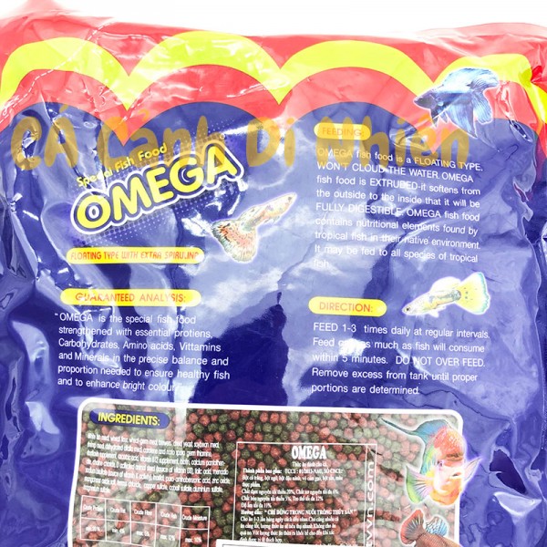 Thức ăn Omega cho cá cảnh (Viên Trung) 500g là thực phẩm, cám cá cho các loại cá cảnh vừa và lớn như cá vàng, cá chép bé, hồng két với nhiều hạt với kích thước khác nhau phù hợp cho từng loại cá.
