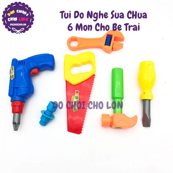 Túi đồ chơi dụng cụ sửa chữa 6 món bằng nhựa cho bé trai 238-7B là loại đồ chơi giáo dục với các món đồ sửa chữa cho bé tha hồ thỏa sức tháo dỡ hay sửa chữa các dụng cụ đồ chơi khác trong nhà vừa giúp bé phân biệt nhận biết được các công cụ mà người lớn sử dụng. Bộ sản phẩm dụng cụ sửa chữa 6 món này với thiết kế đẹp mắt, màu sắt tươi sáng, mô phỏng sinh động các dụng cụ sửa chữa của người lớn, chắc chắn sẽ là món đồ chơi cho các bé trai trong những giờ học căng thẳng. Sản phẩm dành cho các bé từ 3 tuổi trở lên.