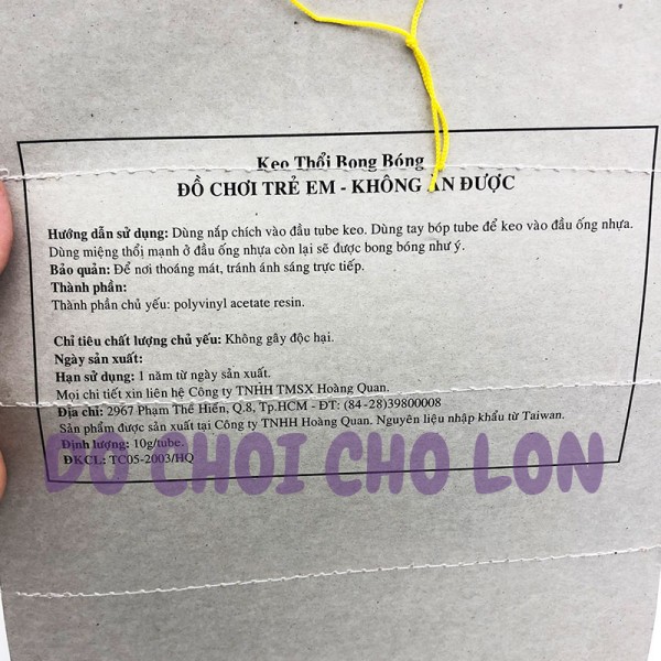 HDSD: dùng nắp chích vào đầu tuýt keo. Dùng tay bóp tuýt để keo vào đầu ống nhựa. Dùng miệng thổi mạnh ở đầu ống nhựa còn lại sẽ được bong bóng như ý.
