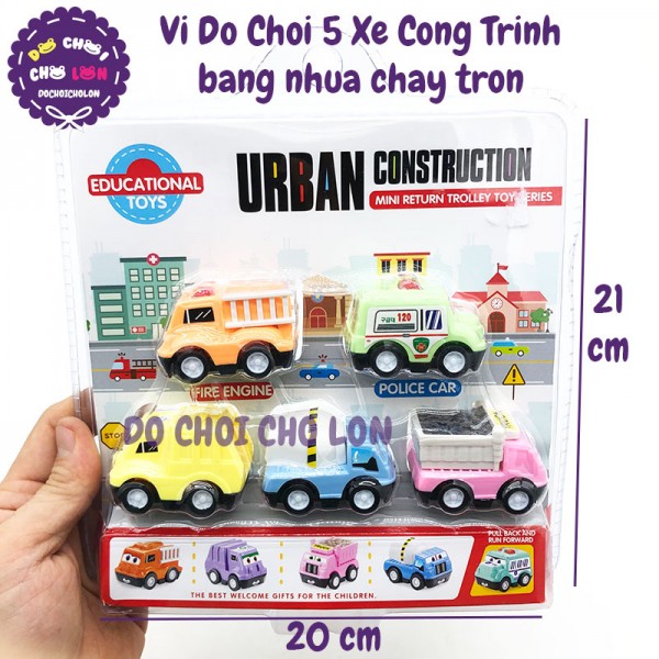 Vỉ đồ chơi 5 xe công trình hình mặt cười bằng nhựa chạy trớn 951-10A là loại đồ chơi xe mô hình công trình mini được in mặt cười dễ thương xinh xắn gồm 5 loại xe khác nhau như xe ben, xe rác, xe thang, xe cứu thương, xe hồ trộn bê tông dành cho các bé trên 3 tuổi.